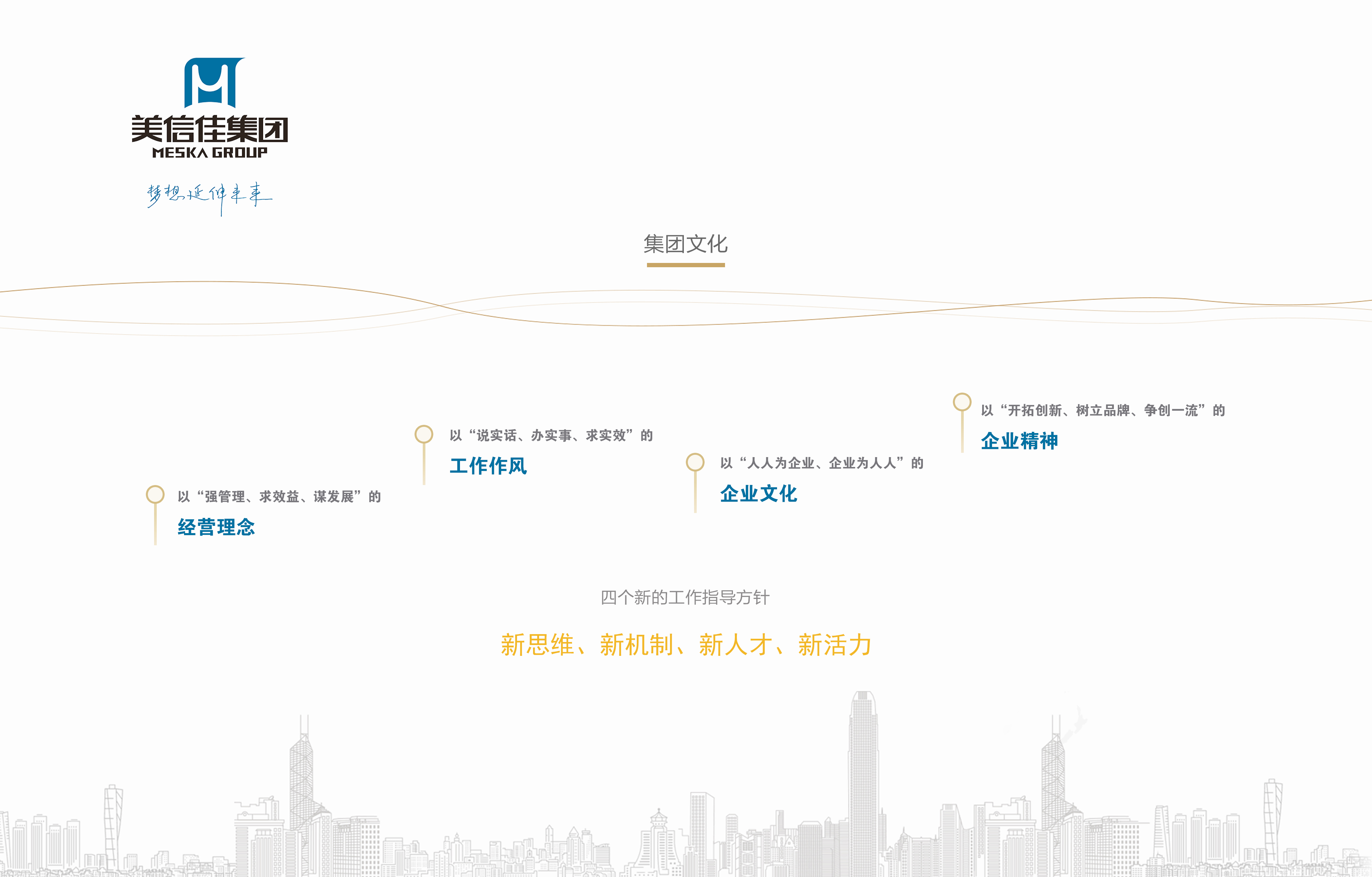 | 公司始創于1994年,時稱湖州市美的建筑裝飾總公司,2010年成立美信佳集團有限公司。歷時多年的創新發展,美信佳集團從建筑裝飾、房地產到貿易、金融再到化工、制藥,現在已發展成為一家跨行業、多元化的綜合型集團。 |